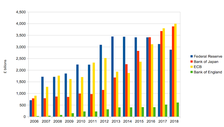 It was the economic crisis of 2007-09 that drove the European, British and American central banks to try QE. They reduced interest rates to unprecedented levels, but it did little to increase bank lending, consumption or investment. By the turn of the decade, they realised their economies were caught in a similar liquidity trap to Japan, which had been pioneering its own QE programme since the late 1990s. Nothing like this had been seen on a global scale since the 1930s.