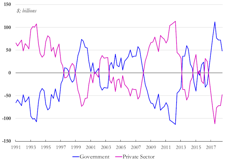 Changes in the financial assets of the government and the private sector mirror each other. Government debt equals private sector financial assets, by definition.